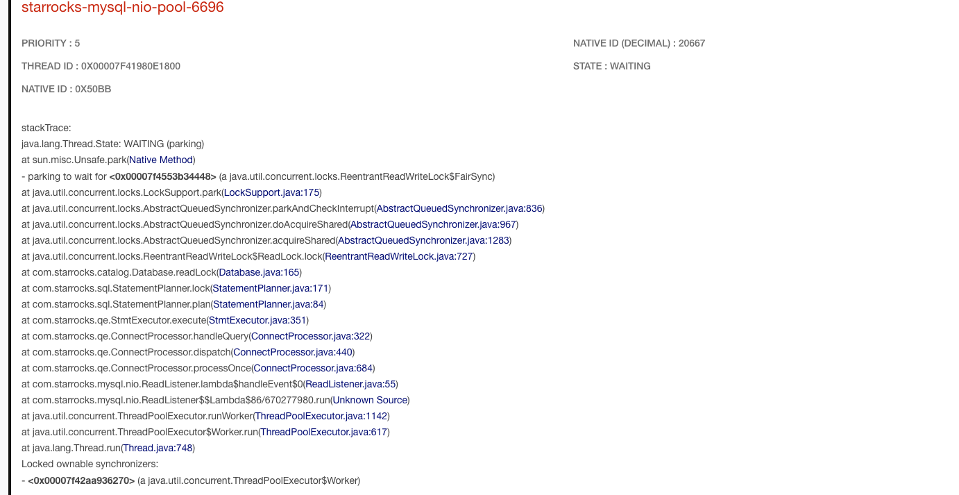 【附件】JSTACK信息,通过分析jstack,发现大量的 starrocks-mysql-nio线程处于wait状态在等锁,怀疑是有线程持有DB层面ReentrantReadWriteLock的写锁一直没有释放有关。