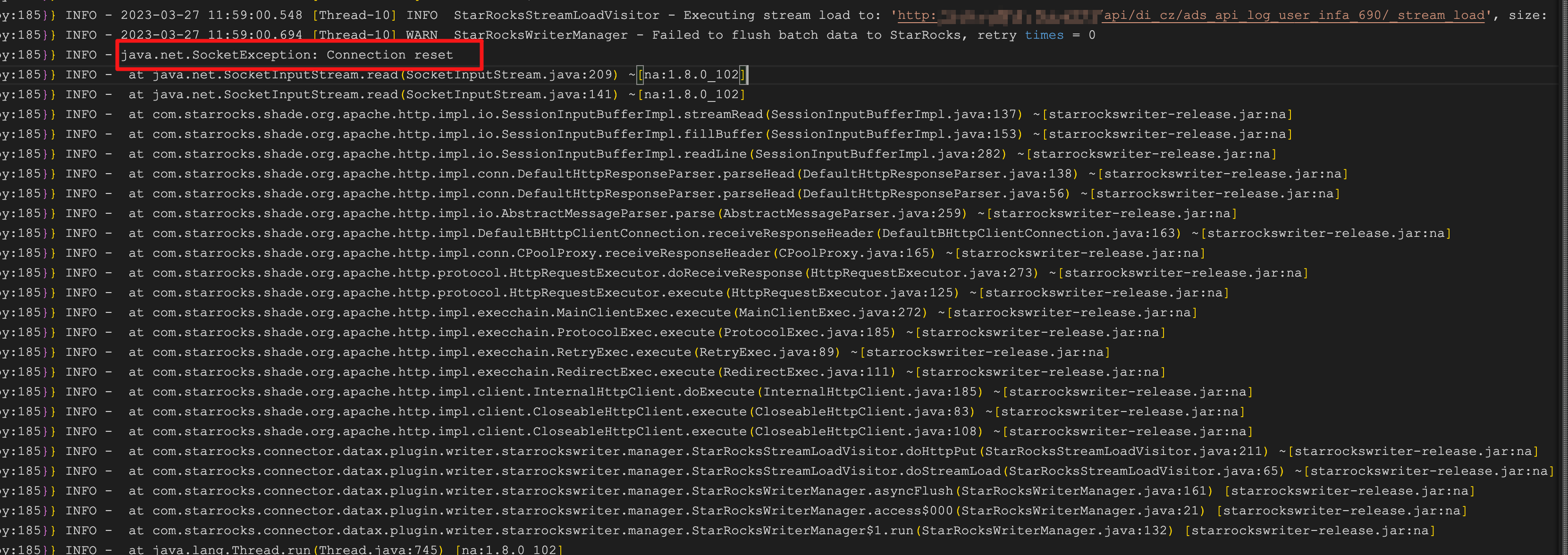 【详述】通过datax的starrocks writer写入starrocks表时,出现connection reset错误 datax的日志