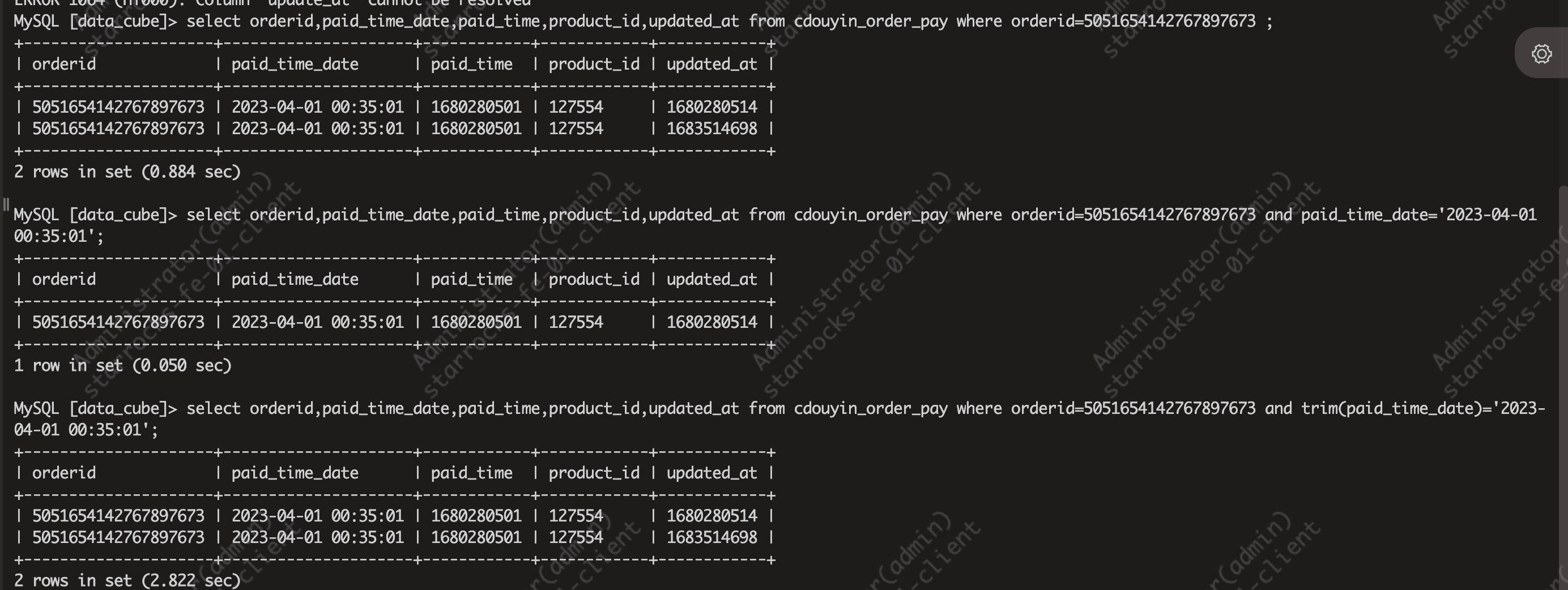 注意:这张表的模型是主键模型,orderid,paid_time_date,product_id是主键