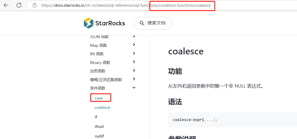 【详述】starRocks3.0文档 参考手册 -> 函数参考 -> 条件函数 -> case 显示coalesce的函数说明