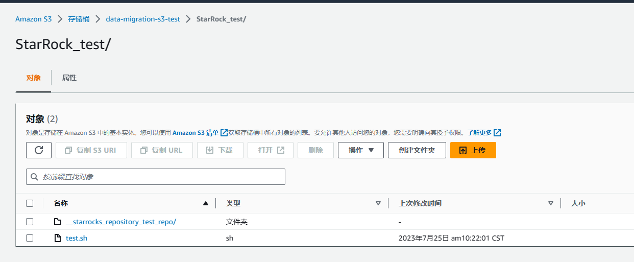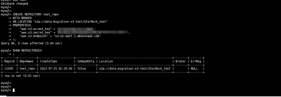 在s3创建的存储桶为data-migration-s3-test,在这个桶下面新建一个文件夹StarRock_test,然后再StarRocks2.5.5中,在创建REPOSITORY的时候,执行语句CREATE REPOSITORY test_repo