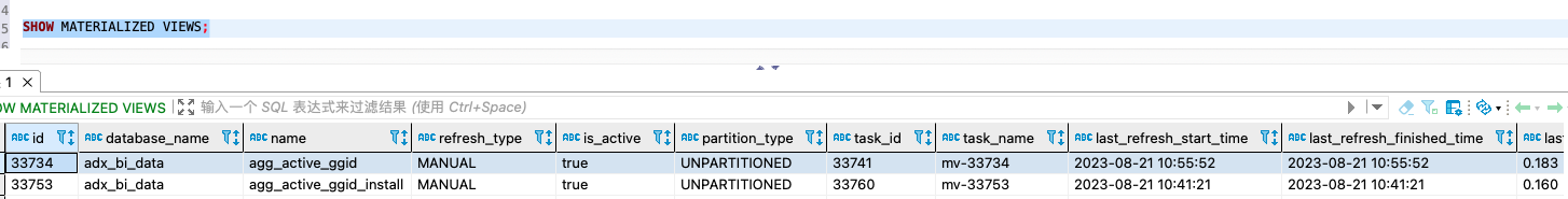 以为是刷新的问题,就执行了 refresh MATERIALIZED VIEW agg_active_ggid;
