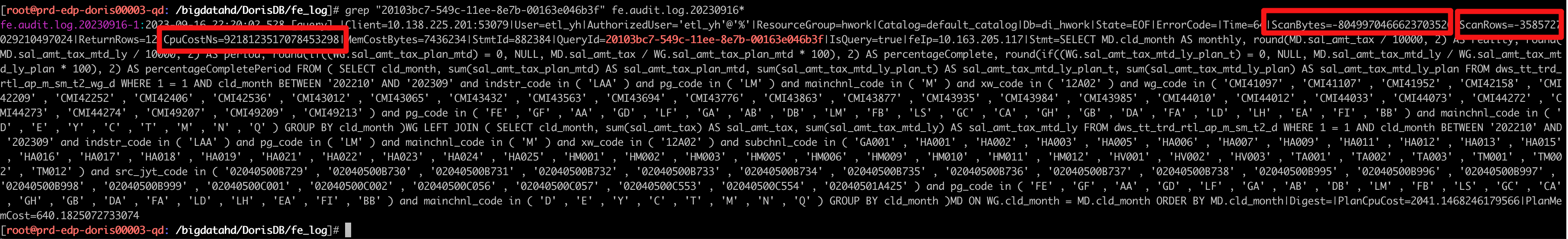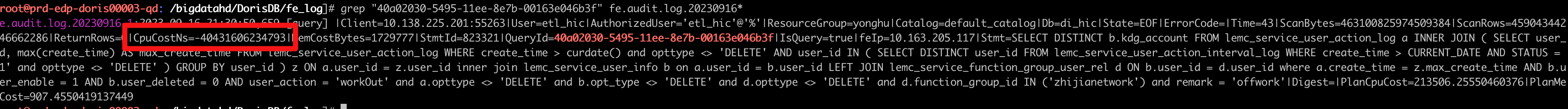 fe.audit.log.20230916-1:2023-09-16 21:30:50,659 [query] |Client=10.138.225.201:55263|User=etl_hic|AuthorizedUser=‘etl_hic’@’%’|ResourceGroup=yonghu|Catalog=default_catalog|Db=di_hic|State=EOF|ErrorCode=|Time=43|ScanBytes=463100825974509384|ScanRows=459043442046662286|ReturnRows=0|CpuCostNs=-40431606234793|MemCostBytes=1729777|StmtId=823321|QueryId=40a02030-5495-11ee-8e7b-00163e046b3f|IsQuery=true|feIp=10.163.205.117|Stmt=SELECT DISTINCT b.kdg_account FROM lemc_service_user_action_log a INNER JOIN ( SELECT user_id, max(create_time) AS max_create_time FROM lemc_service_user_action_log WHERE create_time > curdate() and opttype <> ‘DELETE’ AND user_id IN ( SELECT DISTINCT user_id FROM lemc_service_user_action_interval_log WHERE create_time > CURRENT_DATE AND STATUS = ‘1’ and opttype <> ‘DELETE’ ) GROUP BY user_id ) z ON a.user_id = z.user_id inner join lemc_service_user_info b on a.user_id = b.user_id LEFT JOIN lemc_service_function_group_user_rel d ON b.user_id = d.user_id where a.create_time = z.max_create_time AND b.user_enable = 1 AND b.user_deleted = 0 AND user_action = ‘workOut’ and a.opttype <> ‘DELETE’ and b.opt_type <> ‘DELETE’ and d.opttype <> ‘DELETE’ and d.function_group_id IN (‘zhijianetwork’) and remark = ‘offwork’|Digest=|PlanCpuCost=213506.25550460376|PlanMemCost=907.4550419137449