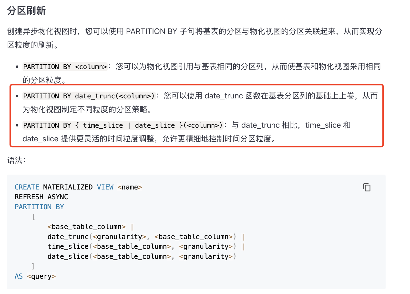 为一张分区表建立物化视图,如果物化视图不包含分区字段,那么即便是原始查询语句没有分区字段的过滤,也会无法改写查询到物化视图上.