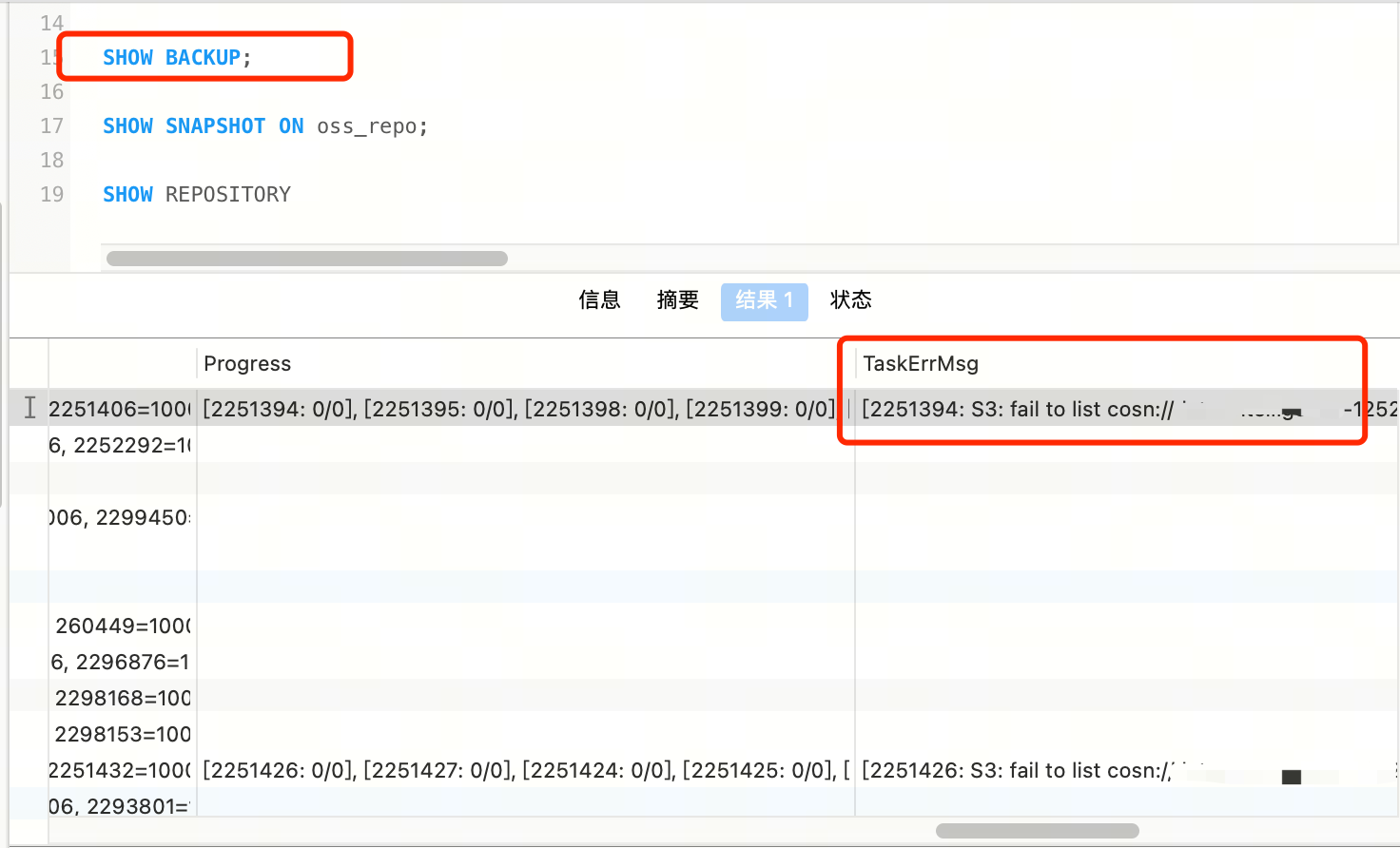 mysql -h ${dbHost} -u ${dbUser} -P 9030 -p${dbPassword} -e “BACKUP SNAPSHOT ${db}.db_backup_${db}_${DATETIME} TO oss_repo”